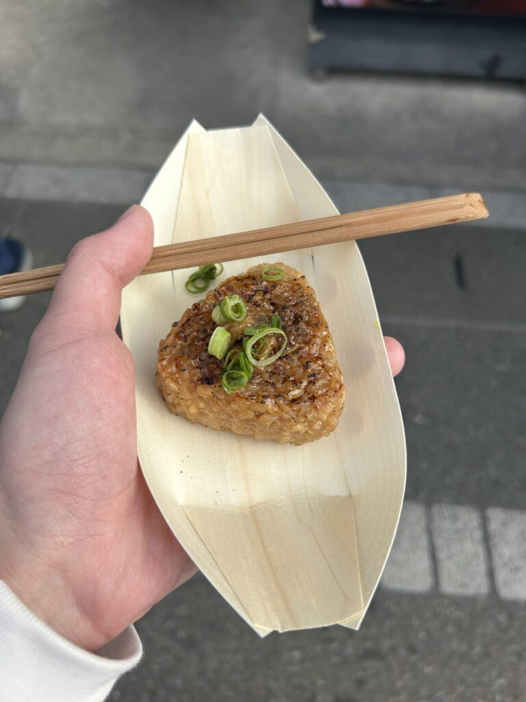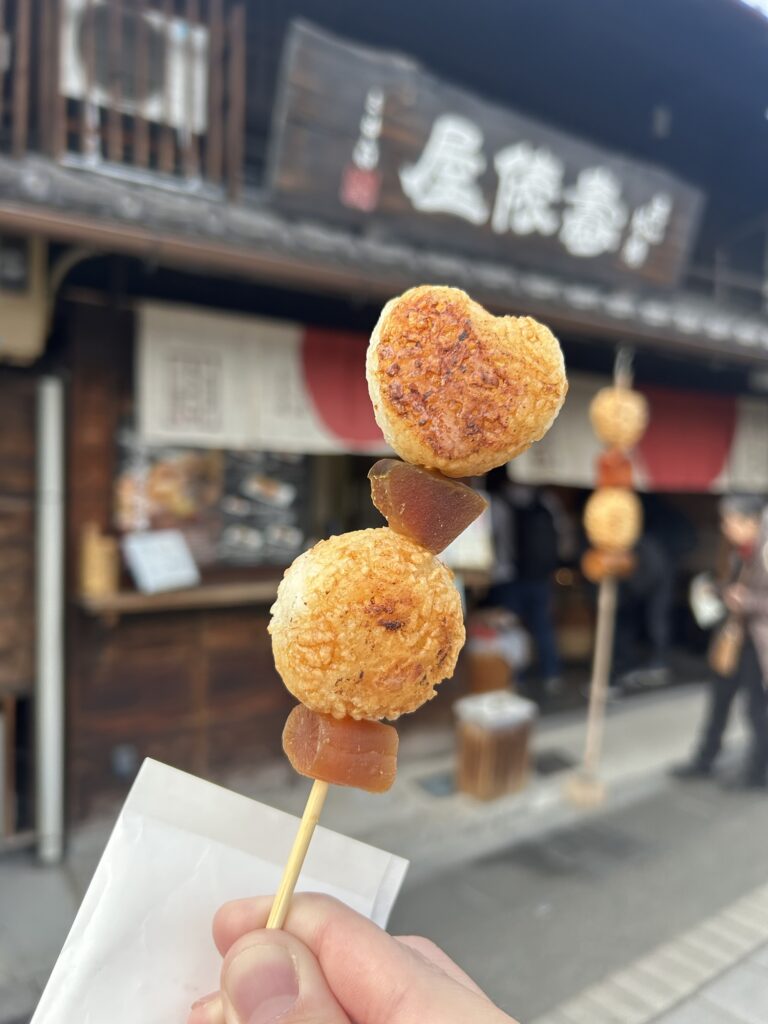 城下町ではおこげ串とひつまぶしおにぎりを食べた。
